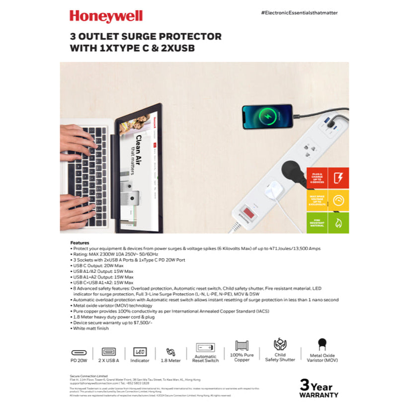 HONEYWELL 3 Outlet Surge Protector with 1 x Type-C with PD and 2 x USB